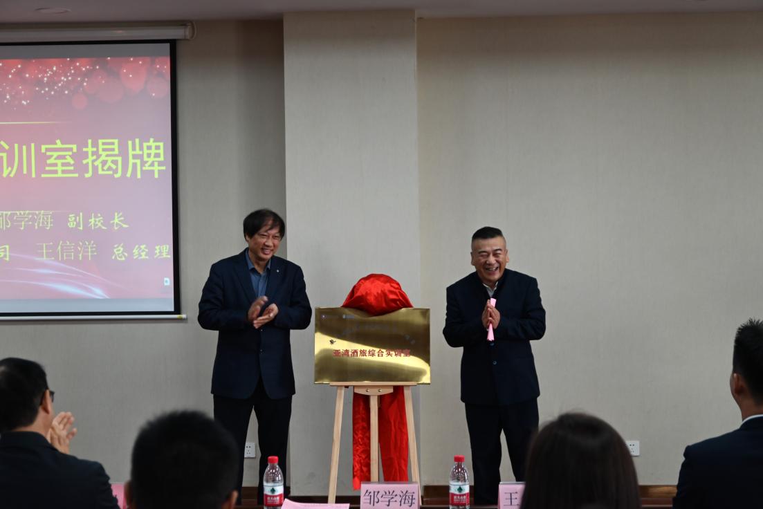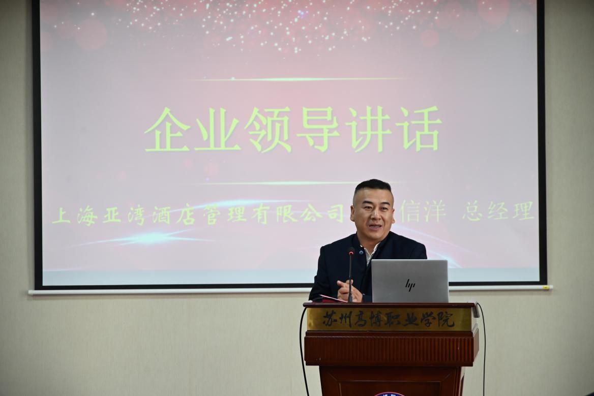 上海亚湾酒店管理有限公司总经理王信洋先生分享了行业发展趋势,强调数字时代酒旅人才需兼具“技术应用能力与人文服务意识”,他以对酒旅行业的热忱感染全场,鼓励师生以专业热爱驱动学习与实践。现场还播放了校企共建酒旅综合实训室的短片,从场地规划到功能设计,每一处细节都凝聚着双方反复论证的心血,让在场学子直观感受“沉浸式”学习环境的魅力。