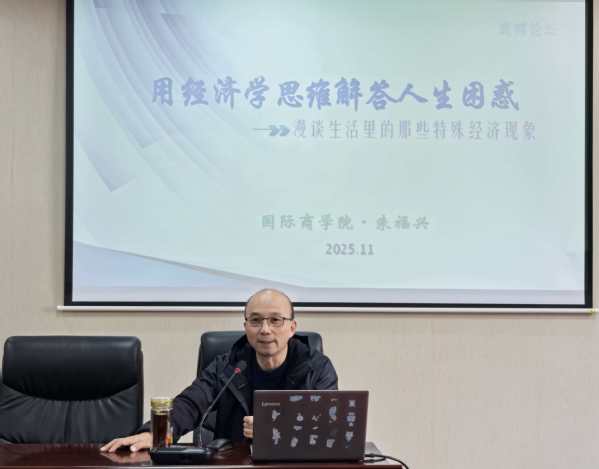 为促进跨学科交流,丰富教师的学术滋养,启发教学创新思维,11月12日下午两点,由特聘教授朱福兴主讲的“用经济学思维解答人生困惑”学术讲座在行政楼14-215会议室举行。本次讲座由国际商学院副院长王东生主持,吸引了众多教师到场聆听与交流。