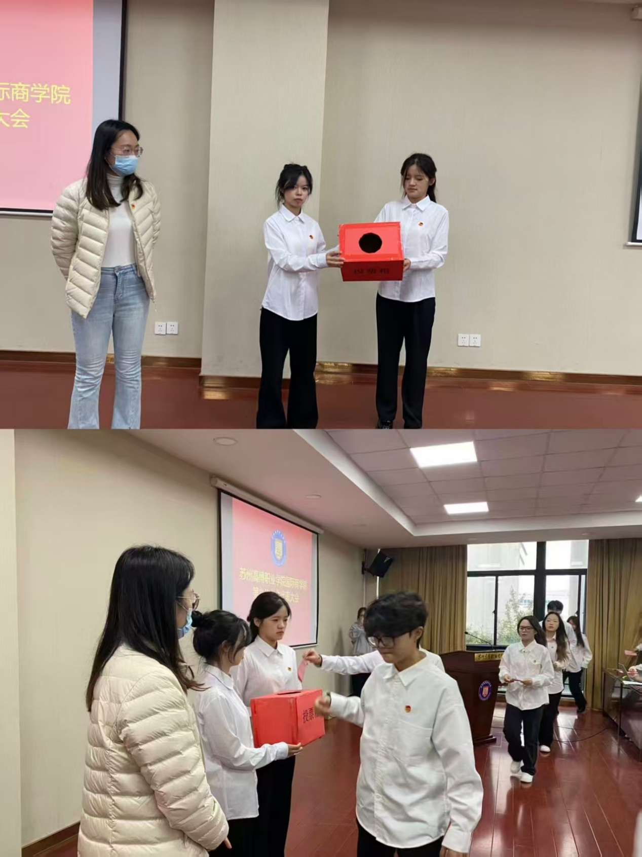 随后,大会进入关键的选举环节。全体与会代表本着公平、公正、公开的原则,以无记名投票方式,庄严投下自己神圣的一票,选举产生了国际商学院第九届学生会主席团成员以及出席苏州高博职业学院第九次学生代表大会的代表。整个选举过程组织严密、程序规范,由李松晏老师、万磊同学、李金玉同学担任监票人,葛轩琪老师、李露倩同学、刘雨佳同学担任计票人,确保了选举结果的真实有效。