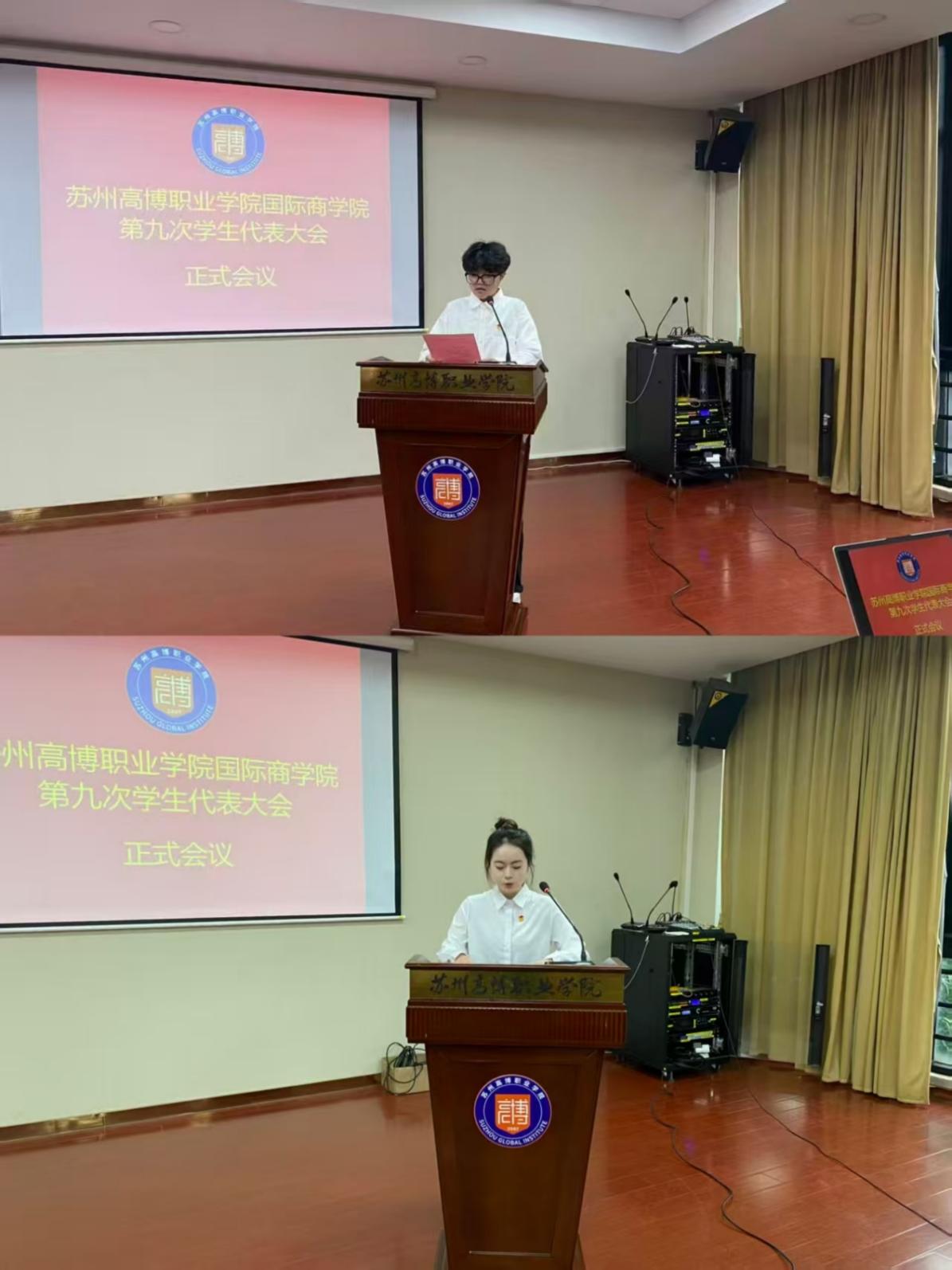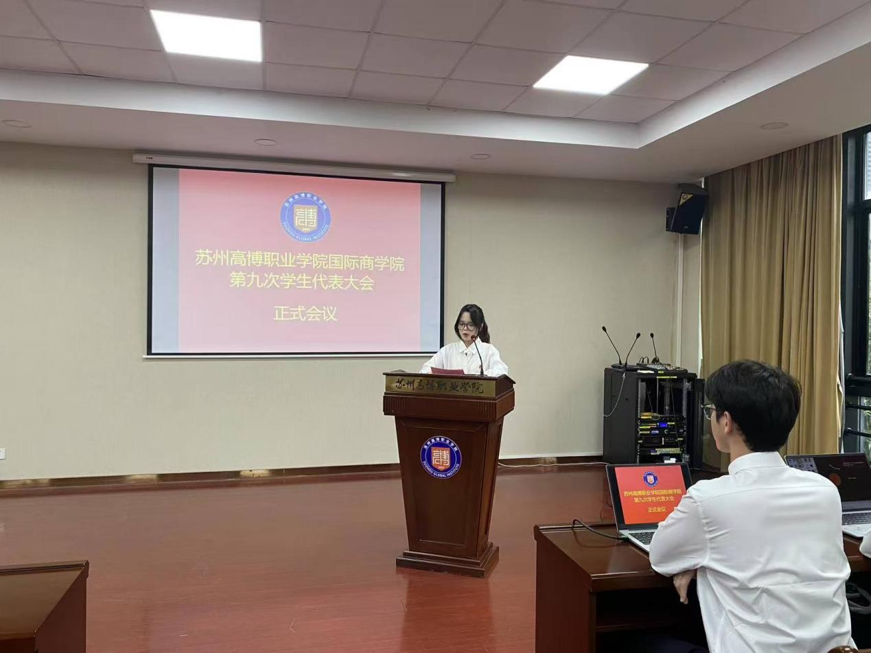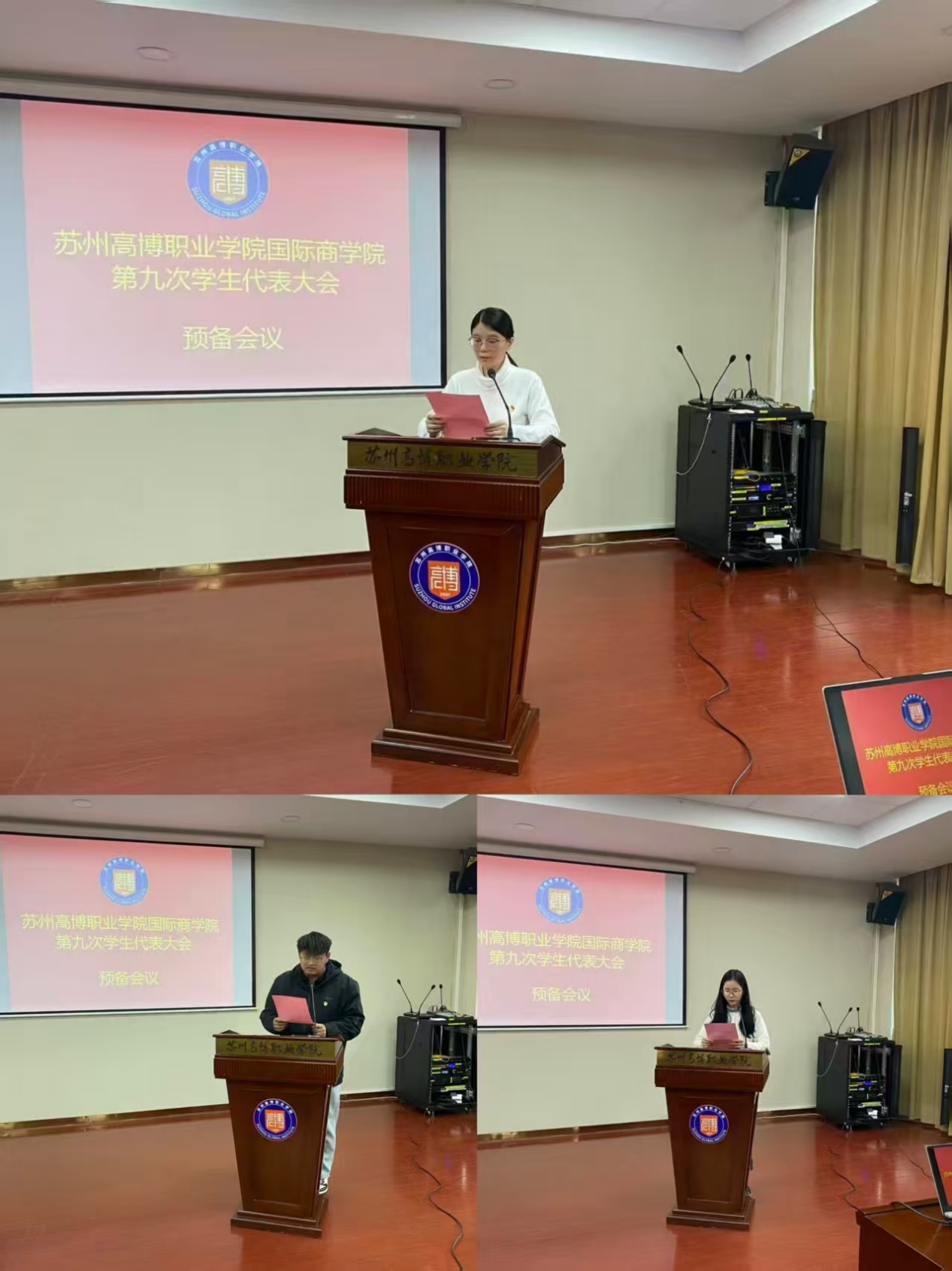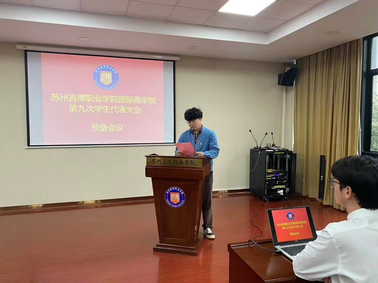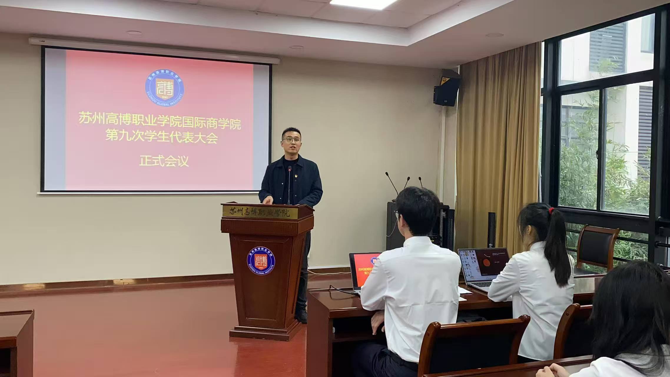 2025年11月17日中午12时30分,苏州高博职业学院国际商学院第九次学生代表大会在14-215会议室隆重召开。本次大会是在学院党总支和上级学联组织关怀指导下,依据《关于召开苏州高博职业学院国际商学院第九次学生代表大会的通知》精神举行的一次重要会议。国际商学院党总支副书记张志豪、学工办主任杜相锋、学院分团委书记姚瑶、国商学生党支部书记马俊涛,以及辅导员李松晏、吕林峰、葛轩琪等老师以及全院共35名学生代表参会。会议由王春雪同学主持。