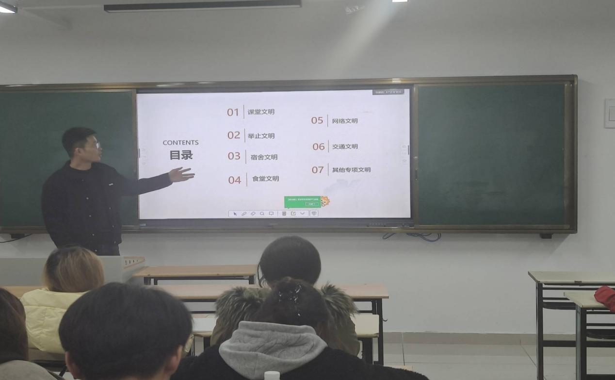 接着,辅导员老师们围绕课堂文明、宿舍文明、食堂文明、网络文明、交通文明、其他专项文明七大板块,展开了全面且深入的强化教育。辅导员以丰富多元的形式,如鲜活的案例剖析、深刻的道理阐释,让同学们清晰认识到文明行为在校园生活中的关键意义。每一个板块都紧密关联着同学们的日常,关乎个人品德修养的塑造,也影响着整个校园的风气与形象,鼓励大家从自身做起、从小事践行。