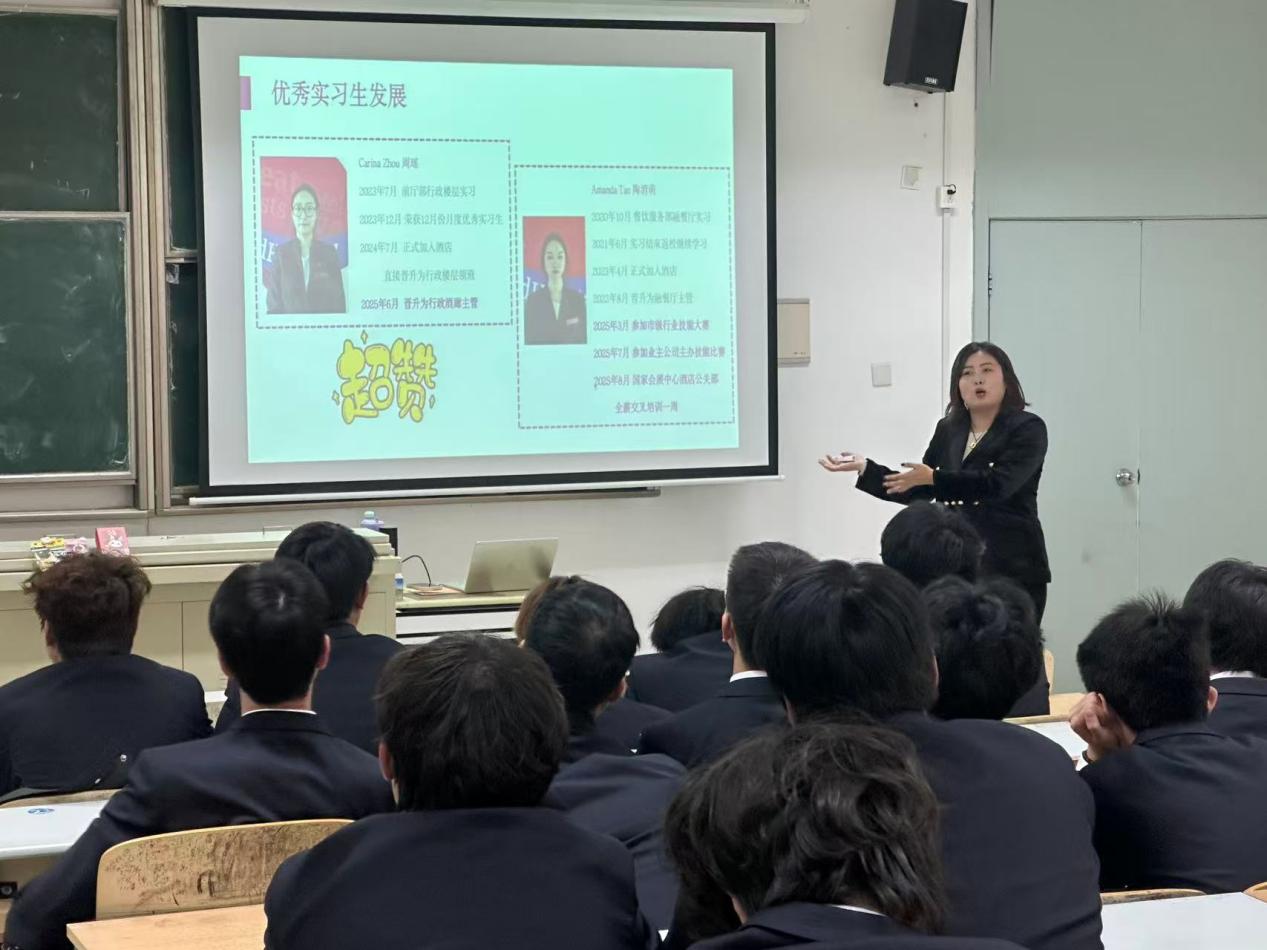 2025年11月28日下午,洲际酒店集团旗下上海复旦皇冠假日酒店培训经理罗玉双女士应邀莅临我校,为25级酒旅专业新生开展专题讲座。讲座以洲际集团全球行业影响力为切入点,深度解读品牌核心竞争力,分享人才培养体系与职业发展路径,为学子搭建起校园与行业的高效沟通桥梁。