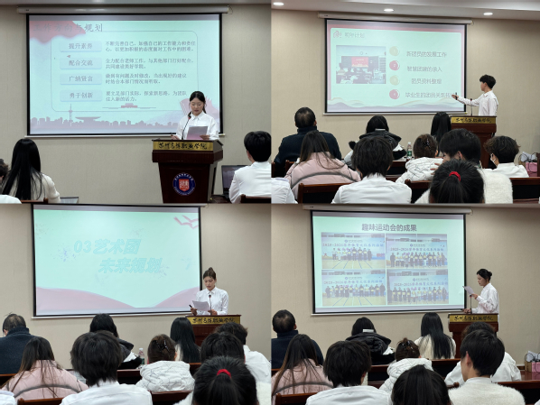 随后,学生会各部门代表依次上台进行年度工作汇报。综合办公室档案室通过详实的数据,系统汇报了本年度各年级的档案管理工作;组织建设部重点介绍了智慧团建系统管理、信仰公开课和团员发展等工作成果;志愿服务部则通过照片生动展示了全年开展的40余次志愿活动情况;体育部和艺术团则分别汇报了在各类赛事和文艺演出中取得的优异成绩。