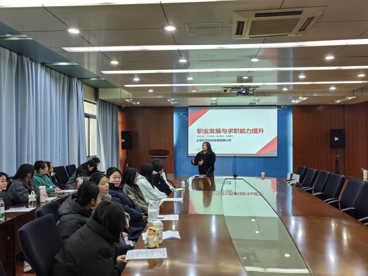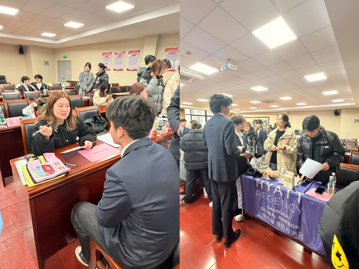 与此同时,15-B201教室中,上海亚湾酒店管理有限公司的专业导师团队为24级酒旅班学生开展了干货满满的研学分享与专场面试指导会。导师们以学生此前赴上海的高端酒店研学之旅为核心,通过现场照片、视频等素材,带领学生复盘研学过程中的行业见闻、各岗位实操体验与企业参访心得,重点提炼了虹桥香格里拉、安达仕等酒店在服务流程、岗位协作、客户需求响应等方面的行业标准与实操技巧,让学生们将研学中的直观感受转化为系统的岗位能力认知。针对下午即将开展的专场宣讲招聘会,导师团队进行了系统化的面试指导,从简历优化的细节技巧、酒旅行业专属的面试礼仪、不同岗位的高频面试问题应答思路,到现场交流的表达技巧与心态调整,进行全方位、细致化的讲解。导师们还结合自身多年的酒店招聘经验,分析了酒旅企业的人才选拔标准,现场邀请学生进行模拟面试,一对一指出问题并给出改进建议,为学生梳理面试重点、解答求职疑问,帮助大家查漏补缺,做好充分的求职准备,有效提升了学生们的应聘竞争力。乔桂明院长、张静常务副院长、顾金峰副院长等领导先后前往两个活动现场参观指导,与企业讲师、导师及学生亲切交流,对活动的精准策划、内容设计与高效开展给予高度肯定,并鼓励学生珍惜与企业面对面交流的学习机会,积极对接行业需求,扎实锤炼专业技能,为未来的职业发展打下坚实基础。