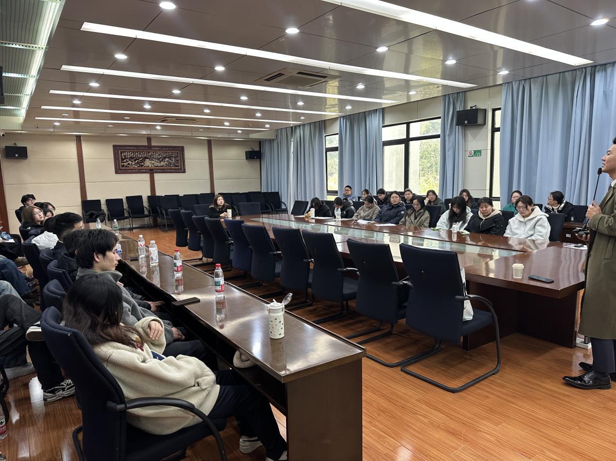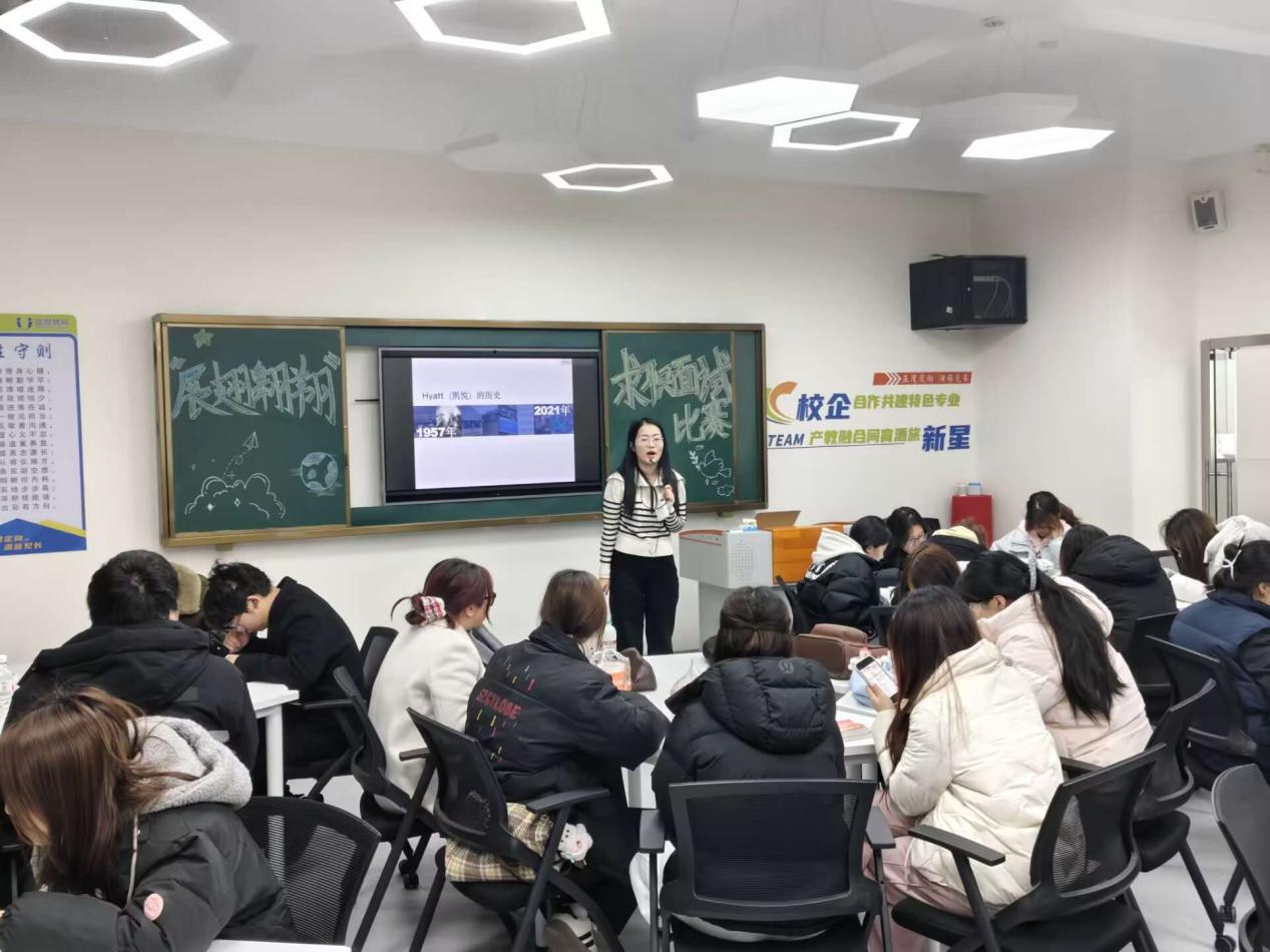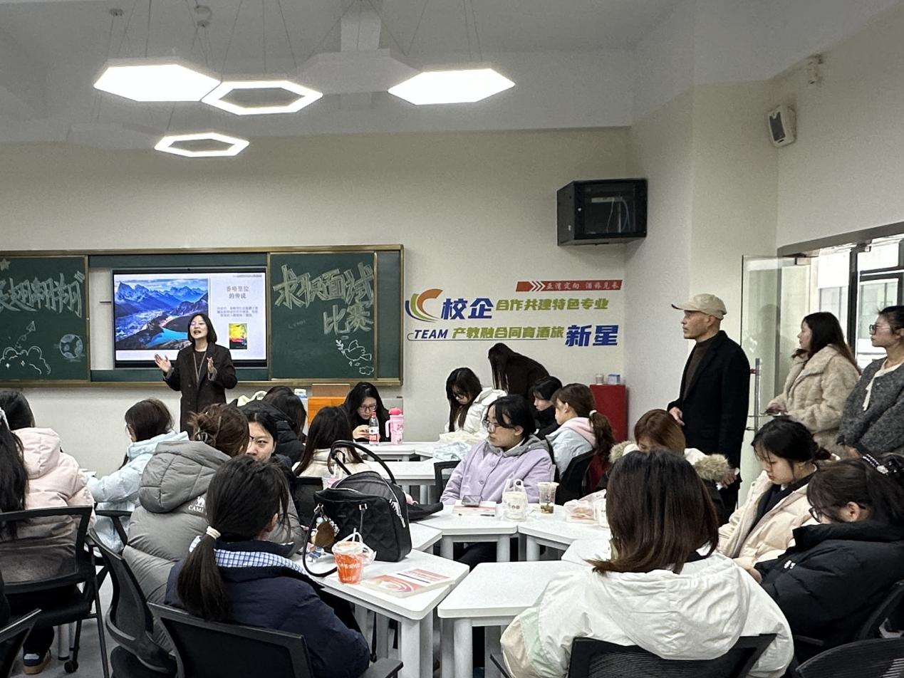 上午8点30分至10点10分,两场特色活动同步开展,精准匹配不同年级学生的成长需求。在12-213酒旅实训室,虹桥香格里拉、新天地安达仕酒店的资深企业讲师为25级酒旅班学生带来《香格里拉集团文化之旅》、《凯悦集团文化之旅》精品企业系列培训。培训伊始,讲师们以行业发展趋势为切入点,结合两大集团的百年发展历程,生动讲述了品牌从创立到成为国际酒旅标杆的进阶之路,让学生们对高端酒店品牌的发展脉络有了系统认知。随后,讲师们聚焦品牌核心文化理念展开深度解读,详细阐释香格里拉“亚洲式待客之道”的核心理念,从细节服务、人文关怀等方面结合真实服务案例,展现品牌独有的服务温度;同时解析凯悦集团“以全球视野演绎本土风情”的品牌特色,介绍其在全球布局中如何兼顾标准化服务与本土化适配。培训中,讲师还分享了两大集团的人才培养体系、岗位设置及职业晋升路径,针对酒旅专业新生的学习困惑,讲解了专业知识学习与岗位技能提升的结合要点,现场通过互动提问的方式,让学生们沉浸式感受国际酒旅品牌的文化底蕴与行业魅力,不仅夯实了新生的专业认知基础,更让大家明晰了后续的学习与职业发展方向。
