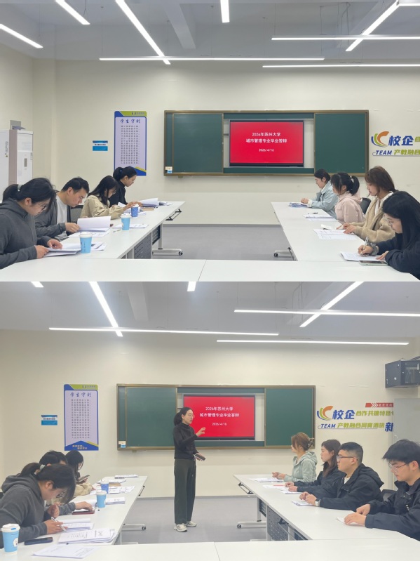 为严把人才培养质量关口,全面检验专接本学生专业学习成效与学术实践能力,4月16日上午10点20分,商学院社会服务系在酒旅实训室214顺利开展了2026年苏州大学城市管理专业专接本学生毕业论文答辩工作。本次答辩由吕雨阶老师担任答辩小组组长,马雪琴、吴振杰、费若怡老师共同担任评审,答辩组织严密、流程规范、秩序井然。